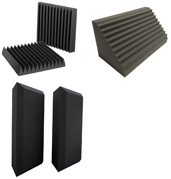 Absorptive materials turn the sound energy and pressure into heat, avoiding it from bouncing everywhere. These are most effective for high frequencies although they can be specifically designed for different frequency ranges. They vary in size and shape depending on its application. We can find bass traps which are designed to absorb low-frequencies specifically. Low frequencies tend to be boosted in the corners of the rooms, so bass traps are usually triangle-shaped and designed for corners.