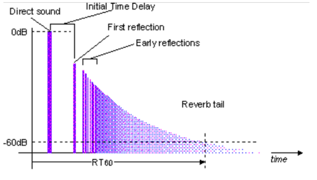 - Early reflections: First and second reflections that arrive at the listener after bouncing once or twice in the space. They are very important for listeners to understand the size and characteristics of a room.