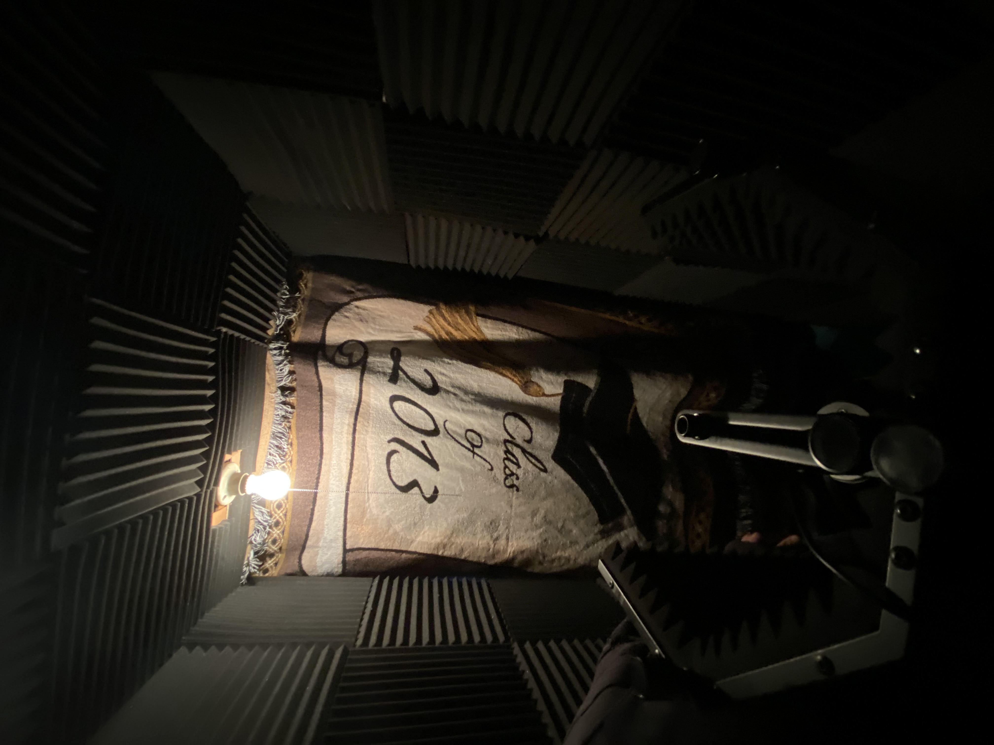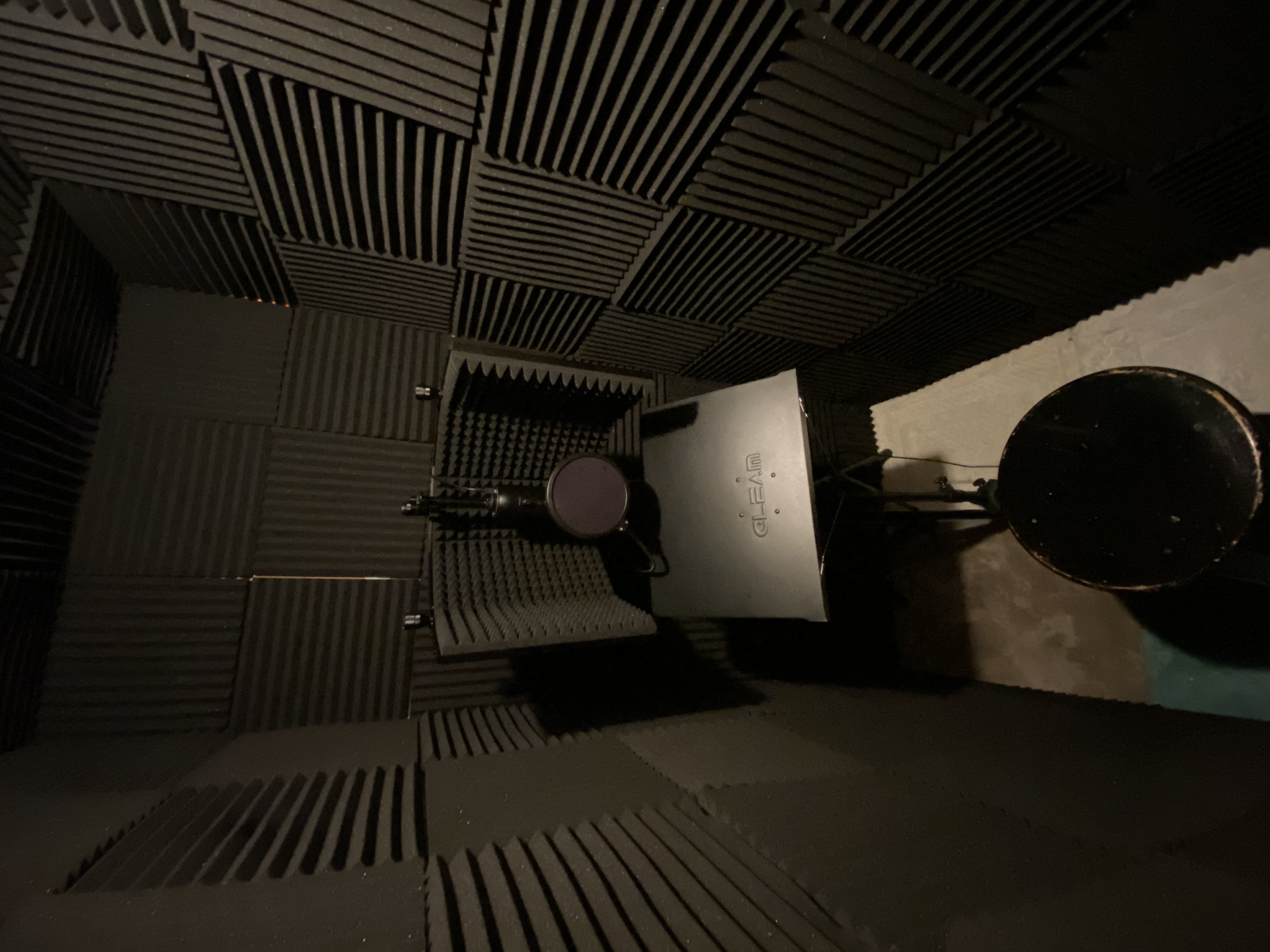 As you can see I have layered everything in 2 inch acoustic foam to limit bounce back, behind is carboard and cement block. Three layers of blankets separate me from the door to prevent sound from coming in. This is also in a storm cellar in my basement with a door I also layered in foam to muffle outside noises. The music stand is placed below my mic and I flip my computer into table mode as to lay it flat on it so as not to catch any reflection from the screen which was a major problem in the old space I used. Finally, I put multiple tiny carpets on the floor to prevent reflections from the cement floor.
