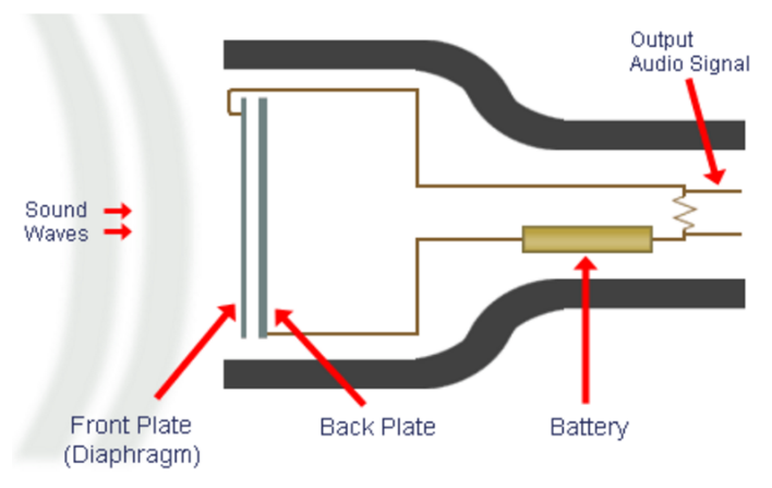 They follow the Capacitor theory and work using capacitors to get the signal and capture the audio. The diaphragm acts as one of the plates of the capacitor while the other one will be inside the microphone. The vibrations from the wind that hit the first plate will produce changes in the distance between plates which will be then translated into the sound that you'll be able to listen to.