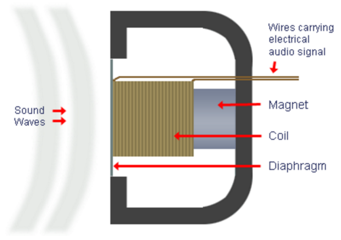 These mics have a movable coil positioned in the magnetic field of a permanent magnet attached to the diaphragm. The diaphragm's vibrations move the coil in the magnetic field, producing a varying current in the coil through electromagnetic induction. Thanks to this, this type of mics can be rougher making them perfect for live performances but less sensitive than condenser mics as well.