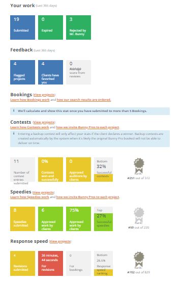 As for the client rejections on the Speedies, one of them was because the client decided that they wanted a female to voice the spot. The other one was cancelled at my request because they requested something that I couldn't deliver even though the Bunny Manager approved my submission which tells me that the manager thought that my work met the original request.