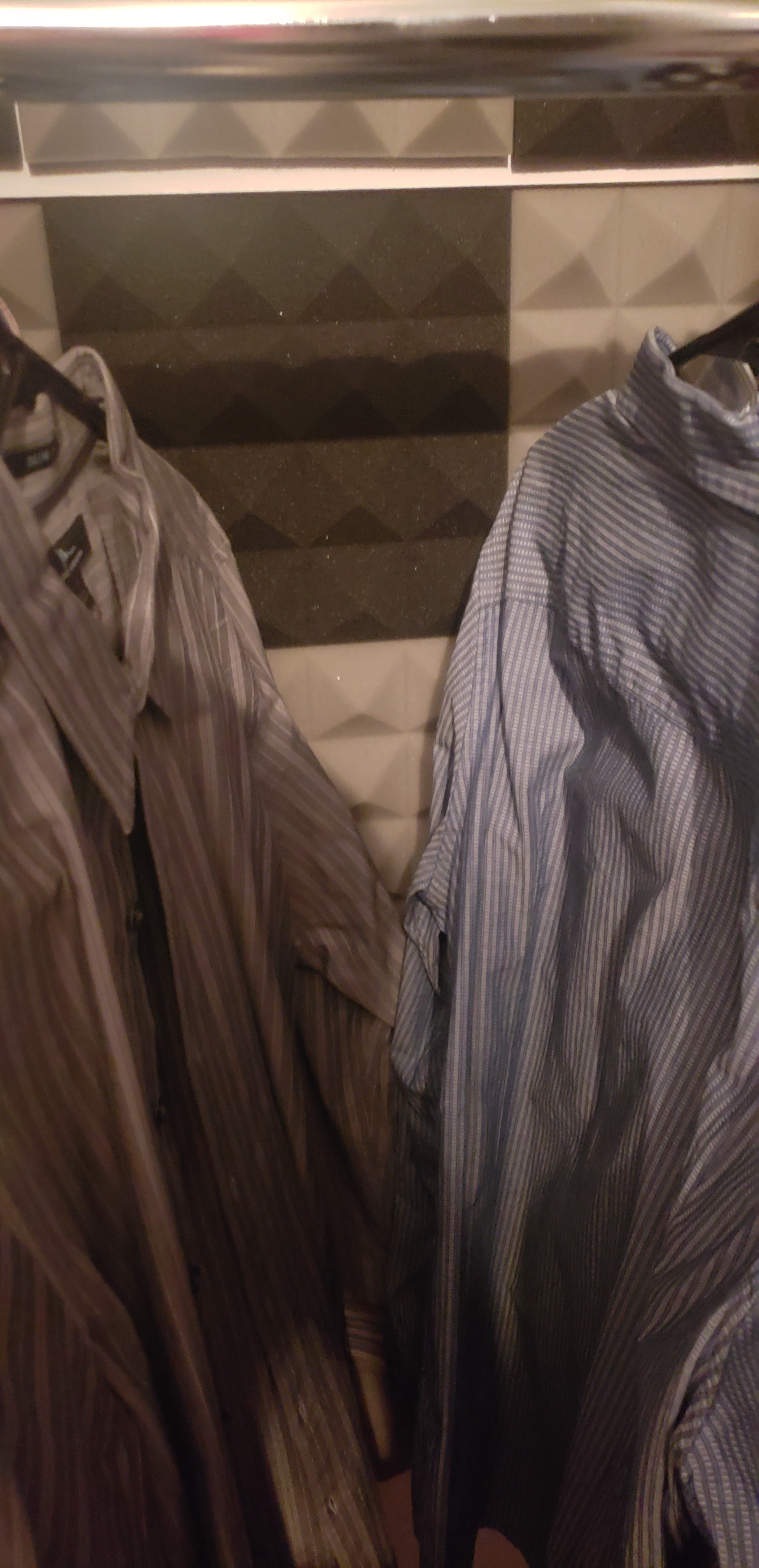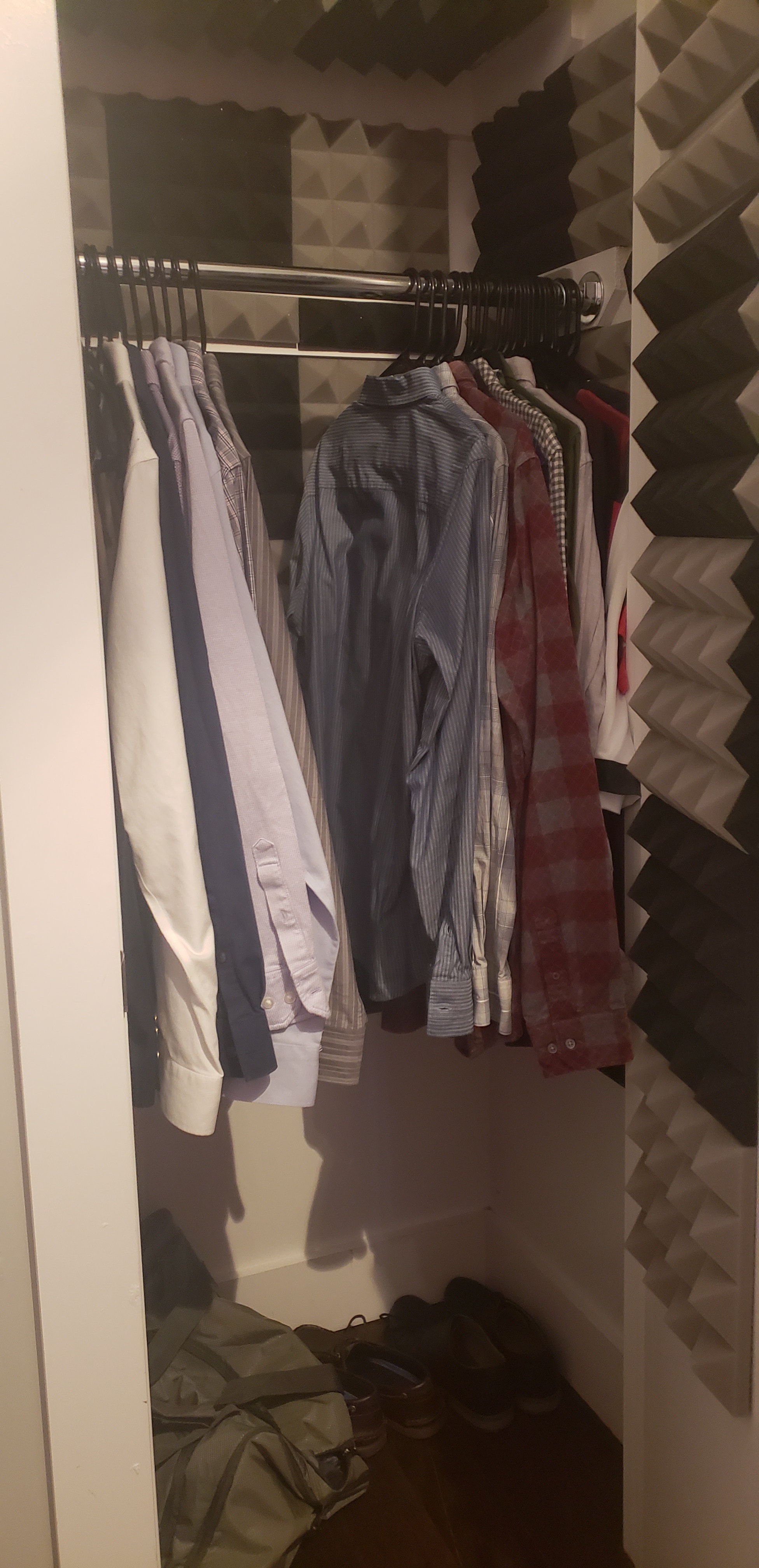 Here is my current setup. My closet is pretty small (that's NYC for you) and so I can't fit in the closet with the clothes inside. I have coated the walls with acoustic foam, and usually sit the mic in the middle of the clothes I also usually put a big blanket down on the floor when I record. I can definitely step back from the mic, but I'm now thinking what if the problem is that my voice is bouncing directly off the wall of acoustic foam and not the shirts. Maybe I should position it right in front of some clothes so there isn't as much direct bounce back. Honestly, this is a world that I'm all new to, and I have no one I know that has any kind of expertise in this. Thank you so much for your help. I really appreciate it.