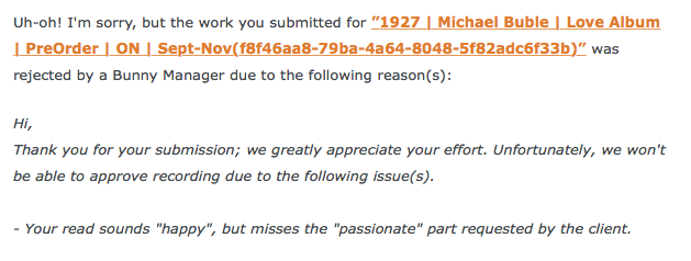 Thanks for clarifying. I do understand the need to critique tone of voice, however I will add that when the client doesn't attach a reference sample, it can be very hard to deduce exactly what someone wants based on the adjectives they provide. The same read might be exactly what one person meant by happy, but not enough for another person – I just think the client has the right to decide in the event that they did not initially provide a reference for voice matching. I've never had a sample rejected for performance reasons before, so that's mostly why I was surprised.