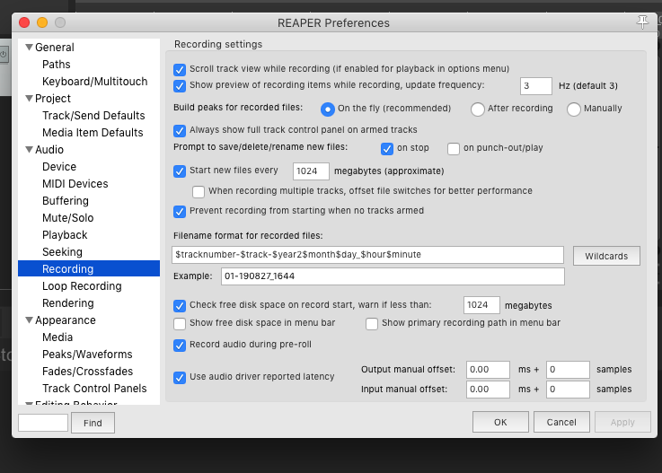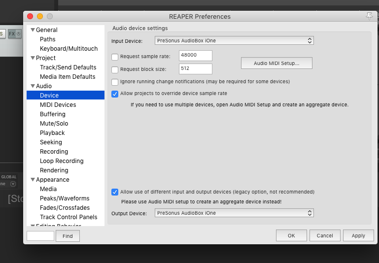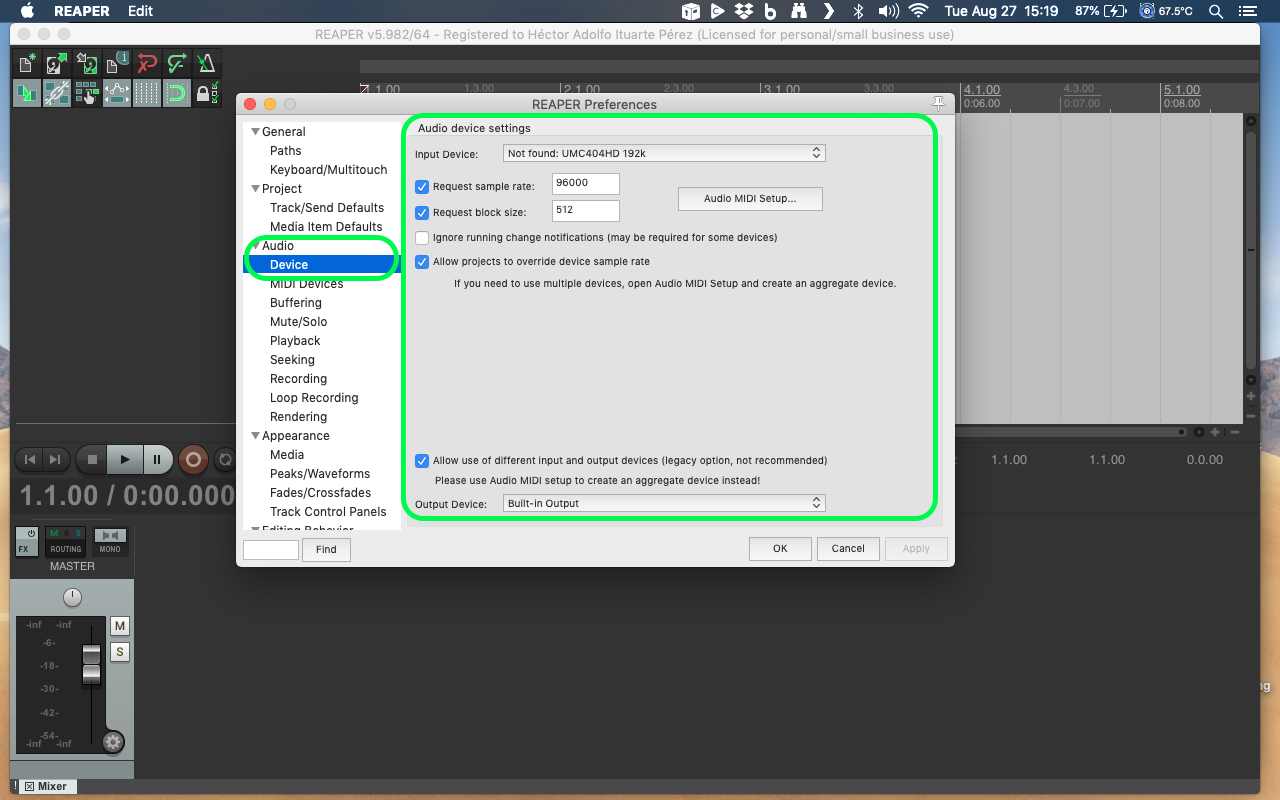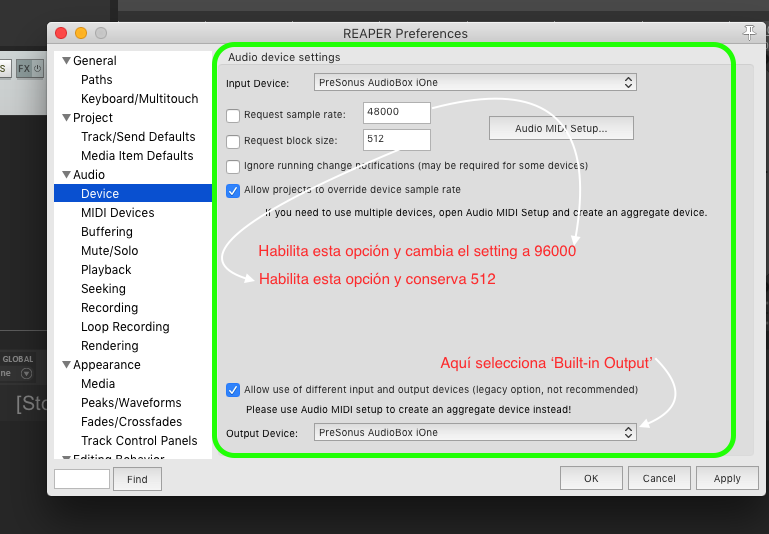 Ingresa a Preferencias en Reaper y mándame un screenshot de cómo se ve este panel...