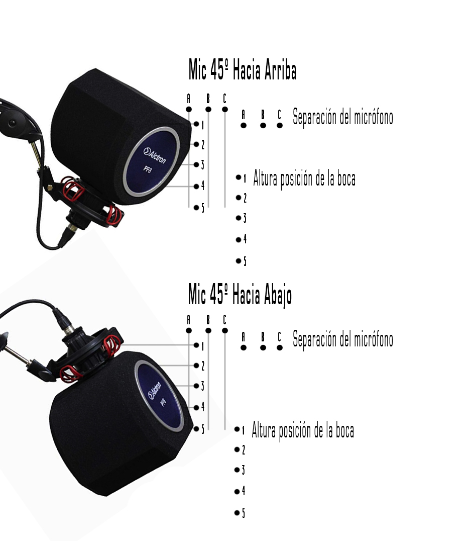 Hice un gráfico con la idea de la posición del mic en 45º, hacia arriba y hacia abajo. También hice una lectura A, B, C sugiriendo 3 diferentes separaciones del mic. Y otra lectura, 1, 2, 3, 4, 5 sugiriendo alturas de la posición de la boca. Por favor revisa este gráfico y dime mas o menos cual posición crees que sería la correcta y si es 45º hacia abajo o hacia arriba.