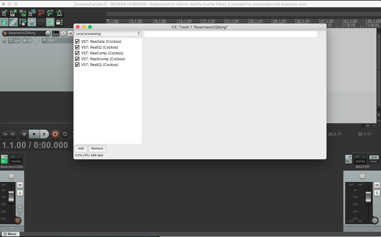 Si prestas mucha atención podrás notar que la diferencia entre mi cadena de efectos premium de cientos de dólares y lo que se puede lograr con los efectos ya incluidos en Reaper, es mínima. La diferencia es la facilidad y el tiempo que se invierte para hacerlo especialmente cuando uno recién comienza a usar el programa.