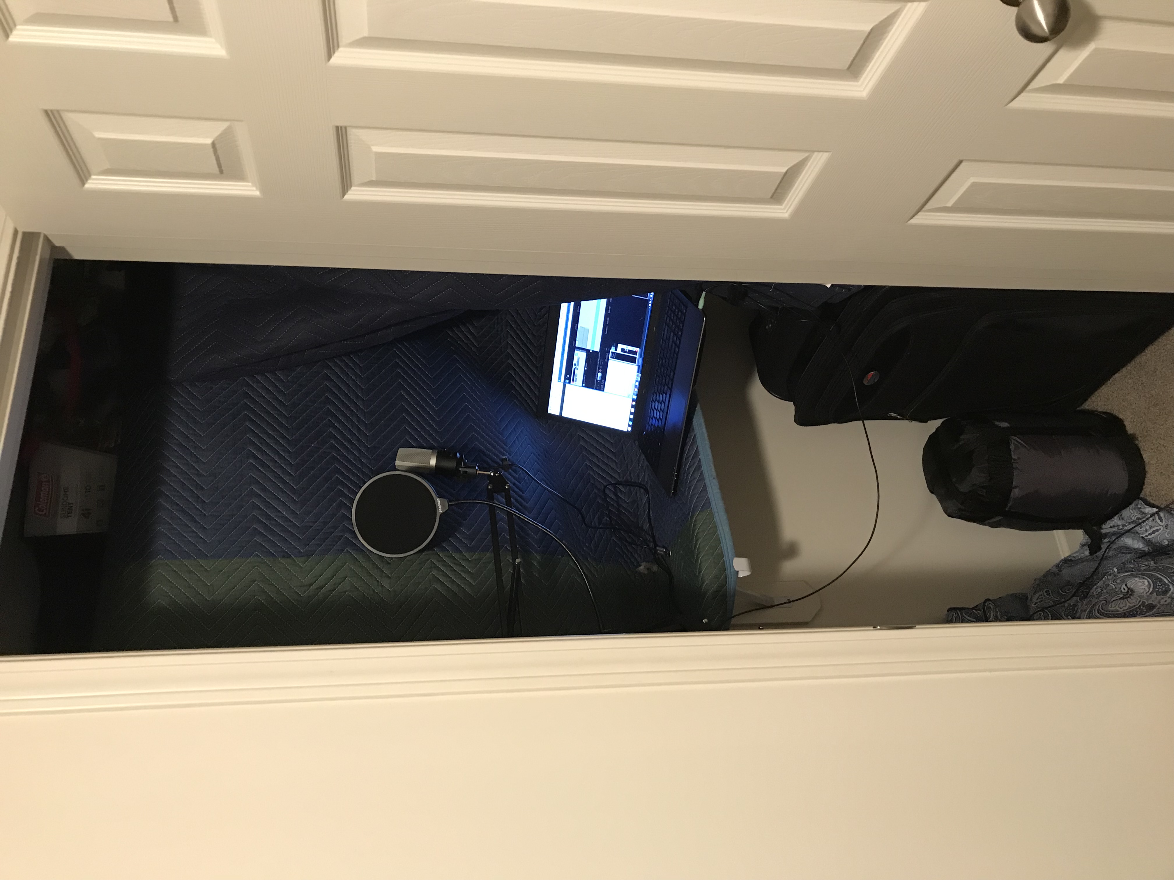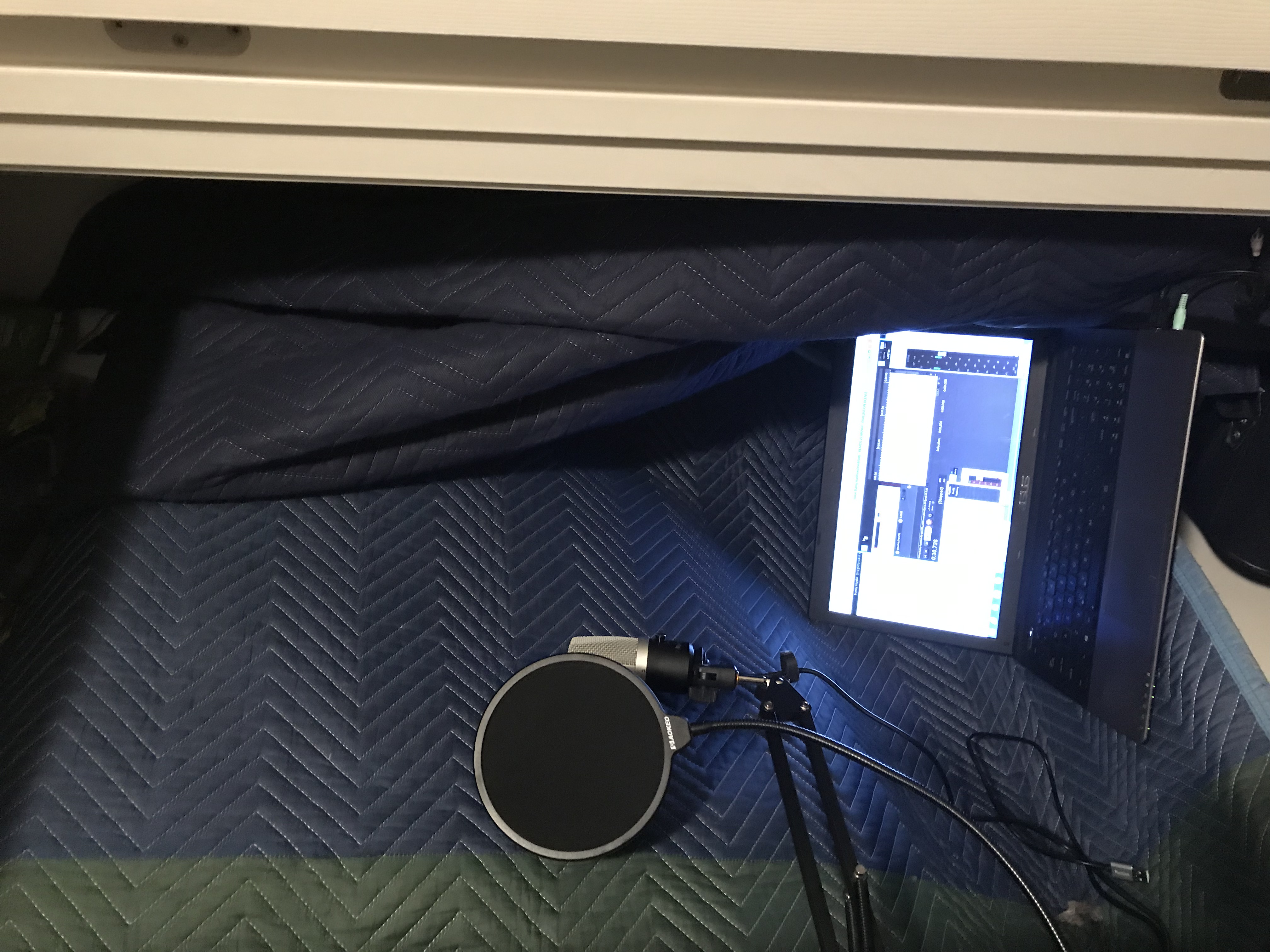 Now onto the technical stuff... Right out of the bat: that mic won't cut it, not when you're competing with people who work with mics of over $1000 and interfaces of similar price/quality. Now, don't get me wrong: you can perfectly achieve a great sound with an investment of around $500 to include everything you need to record, especially because your space sounds very good already, but that's the next issue. For a microphone, with your space and acoustics, you could benefit from an Audio Technica AT2035 mic, a Behringer 204HD interface, you can even pay the $60 Reaper license and even have some cash left to get a pair of Sony MDR-7506 so that you can hear what we hear. If you still have some spare money, go for more acoustic treatment: buying a mattress top made from memory foam (2" or thicker) will make for an amazing material for sound absorption which you can tailor into custom panels for your space and it's literally 10 times cheaper than buying super expensive 'acoustic foam' that underperforms most of the time.