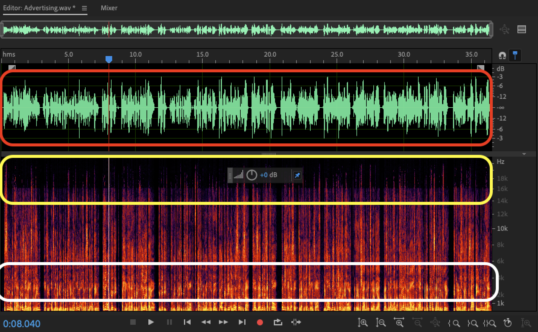 He’s compressing the audio which is making his little room echo much more present (you can see the frequencies of his reverb in white). In yellow, he applied a noticeable low-pass or another kind of EQ, which contributes to the metallic signature of his sound. The audio wasn’t normalized to -3 dBFS either, so that also plays into his issues. He needs to record at lower gain settings, improve his mic positioning/acoustic treatment a bit, lose the compression and EQ. Maybe a clean sample will tell us more.