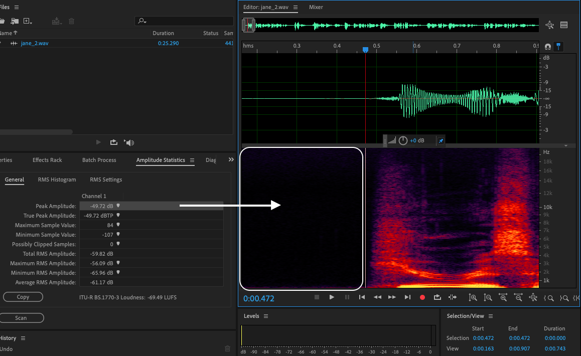 As you can see, this reading and spectral analysis of your waveform indicate that the white noise level is almost double our current quality standard of -90 dB. This could be a consequence of tracking gain levels and of course, the inherent noise of your mic/interface.