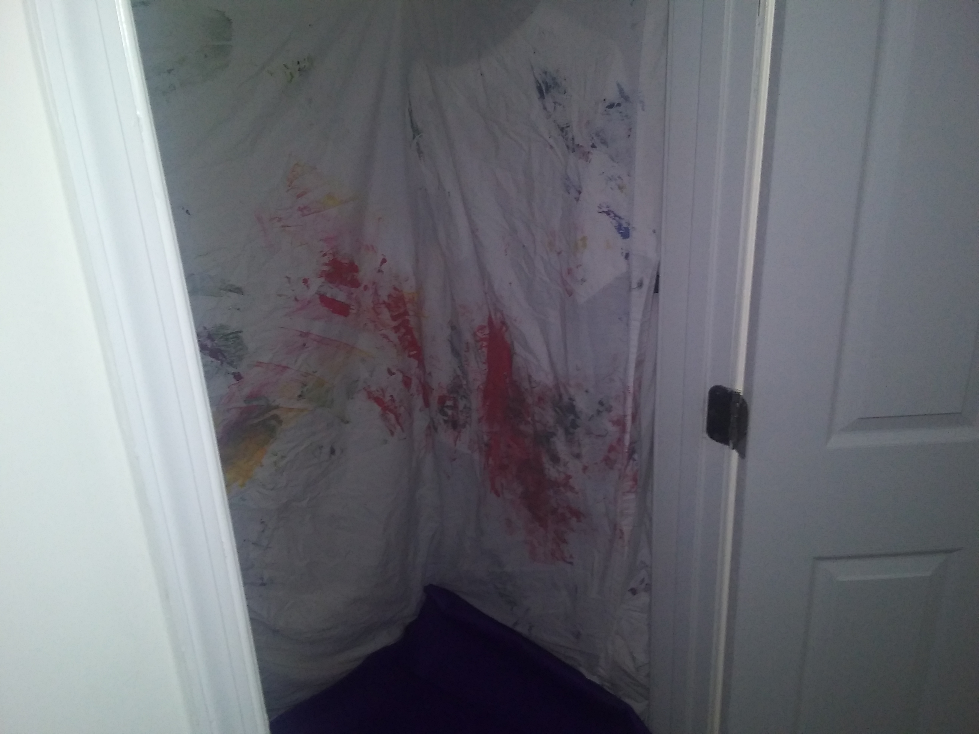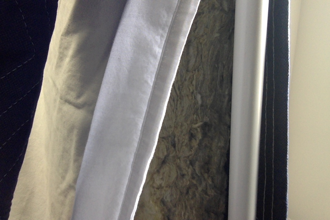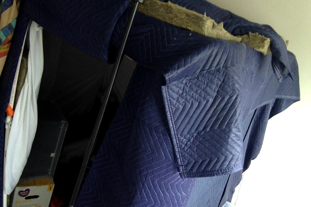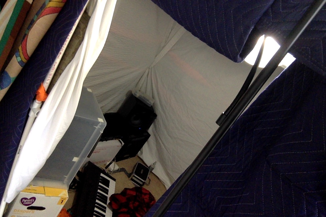 The frame of the recording space is held up by PVC piping and layered with insulation and moving blankets.