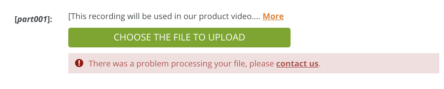 I have already done the recording of my test project within the requested time. However, when I try to upload it, it shows on the screen: "problem occurs when processing your file, please contact us." I have double checked to make sure it is at the requested 44.1 KHz, 16 bits, and a WAV file.
