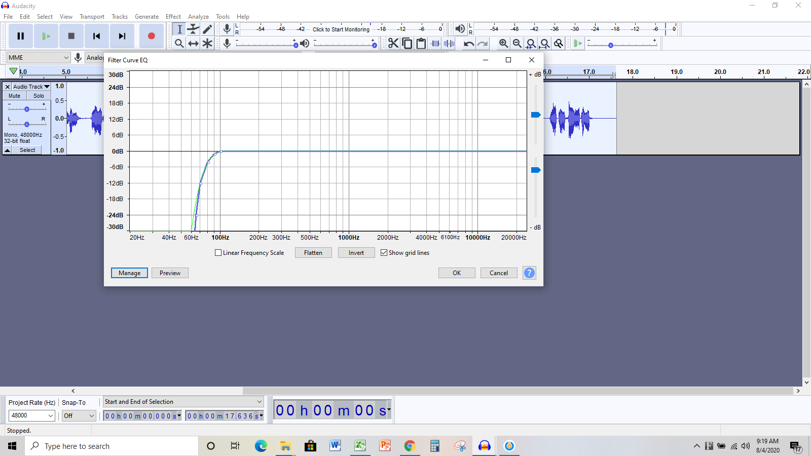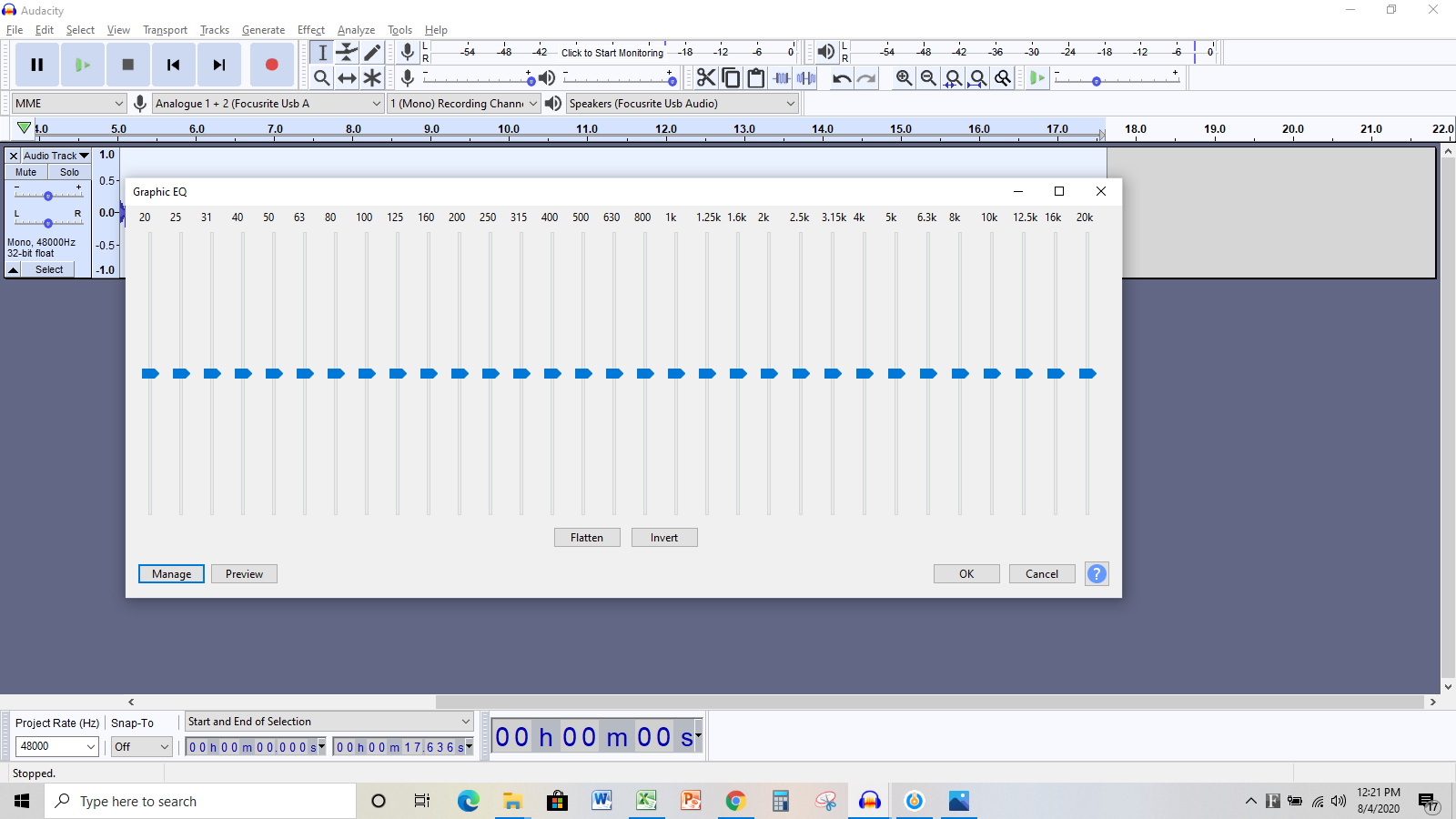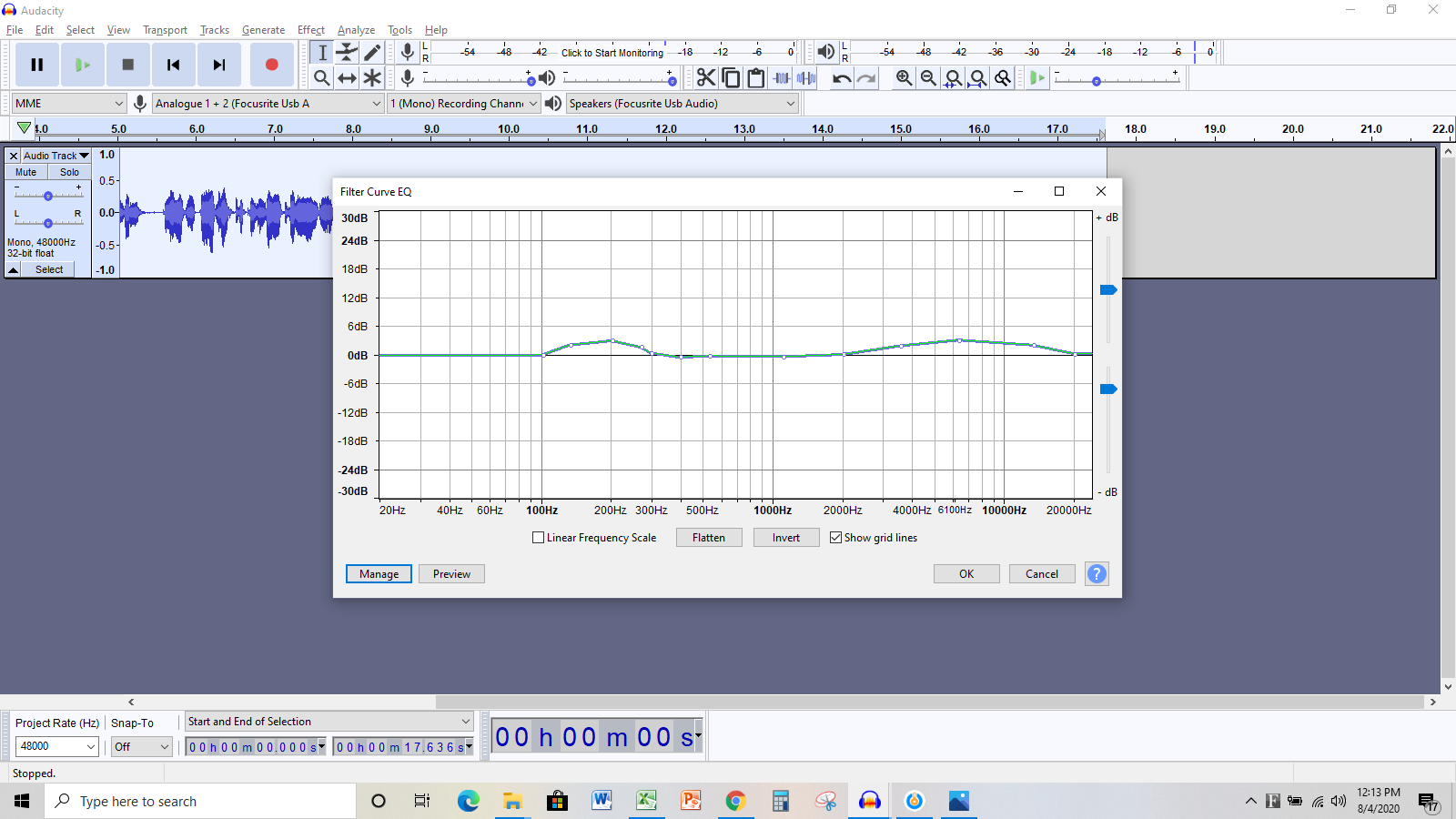 Based on the way the graph is set up on the EQ screen shot I sent, how to do you suggest I adjust it? Audacity is the DAW I have been trained in, so I don't know how to use any other one. I know I have the option of playing with the EQ manually like this: