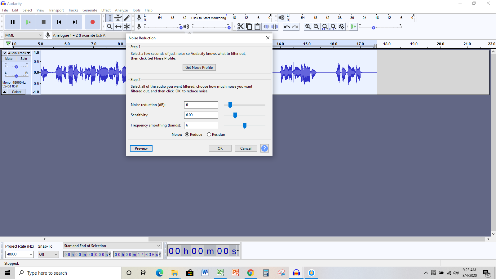 As for the noise reduction, I don't particularly use Audacity, but I found this tutorial for you, seems like it could shed some light on what we need here https://www.youtube.com/watch?v=gnEWfAEONTA