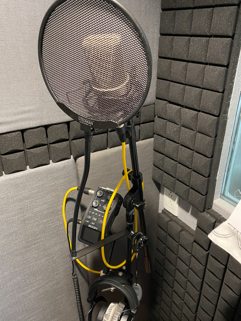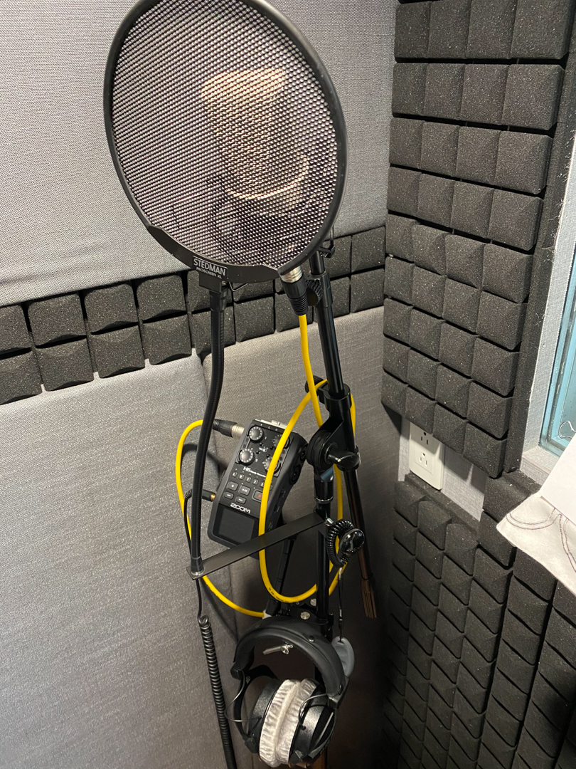 5. Sound Booth: Acoustic blankets 9VB-71G) from Vocal Booth To Go. Three blankets on a portable stand. 1 on top and 2 around having a complete enclosure
