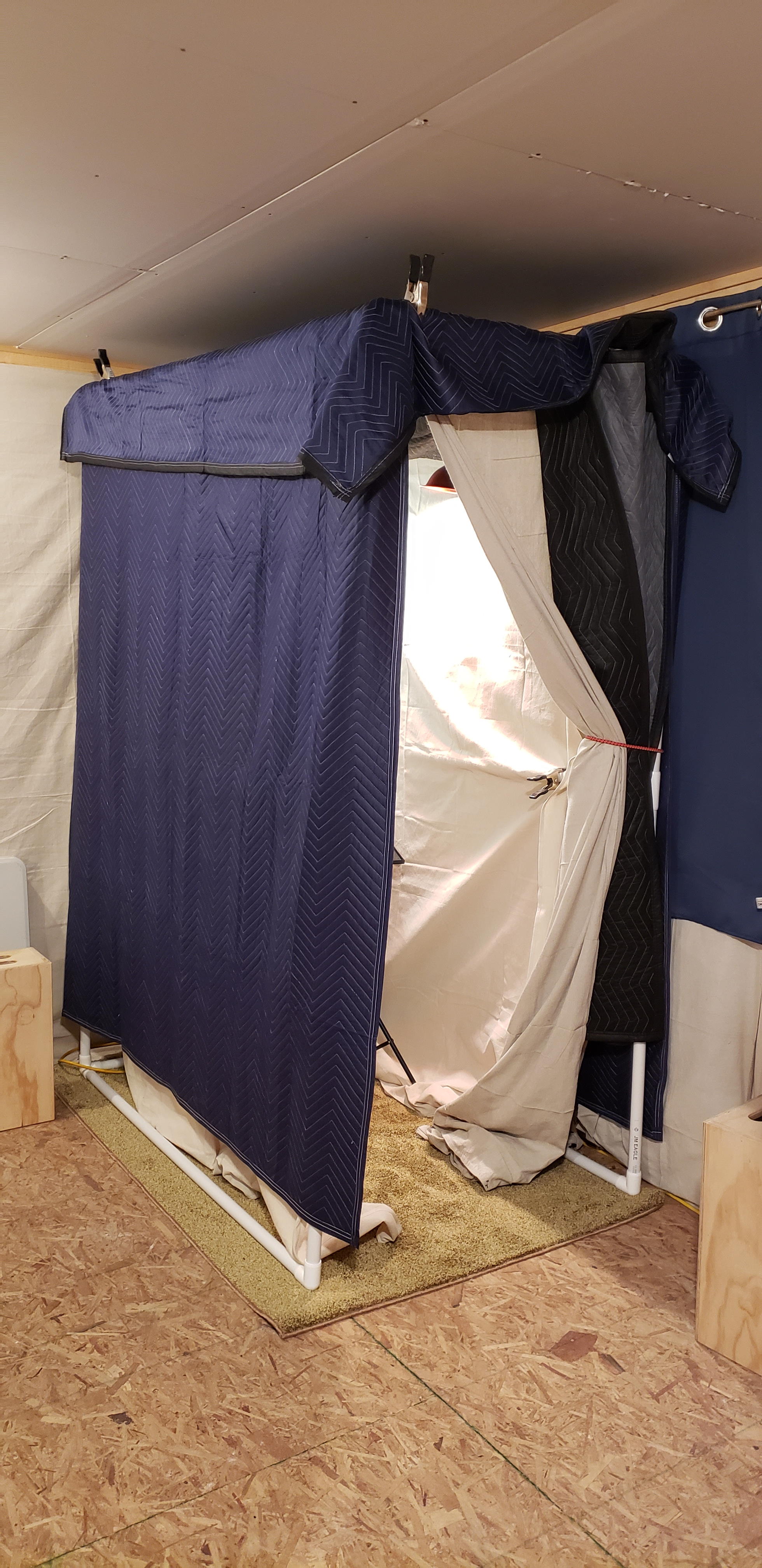 Thanks for the kind offer to help me improve my sound. Here is my current setup. I've added the rug and the top since I did the demo to try to cut down on exterior noise and early reflections.Before I did that it was just hard surfaces on the floor and ceiling. I'm planning on adding some hanging foam panels as well. Any suggestions there? You mentioned mouth noise, which I didn't notice, but it could be I'm blind to it. Would moving back off the mic a bit more help there? Also, any recommendations on lowering my noise floor? I'll do some new testing now that I've added some more hacked sound deadening.