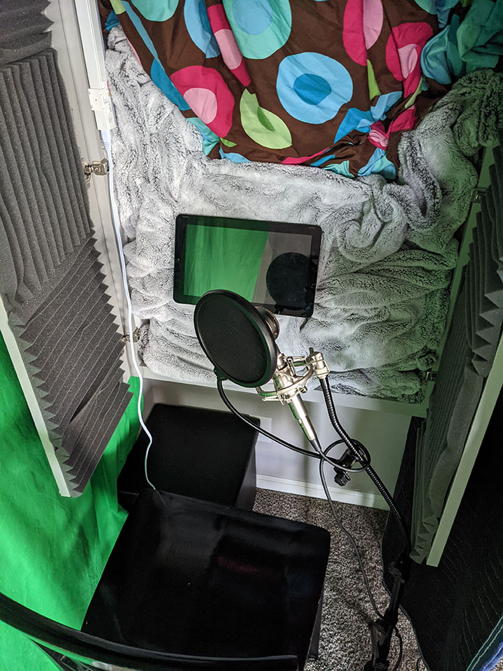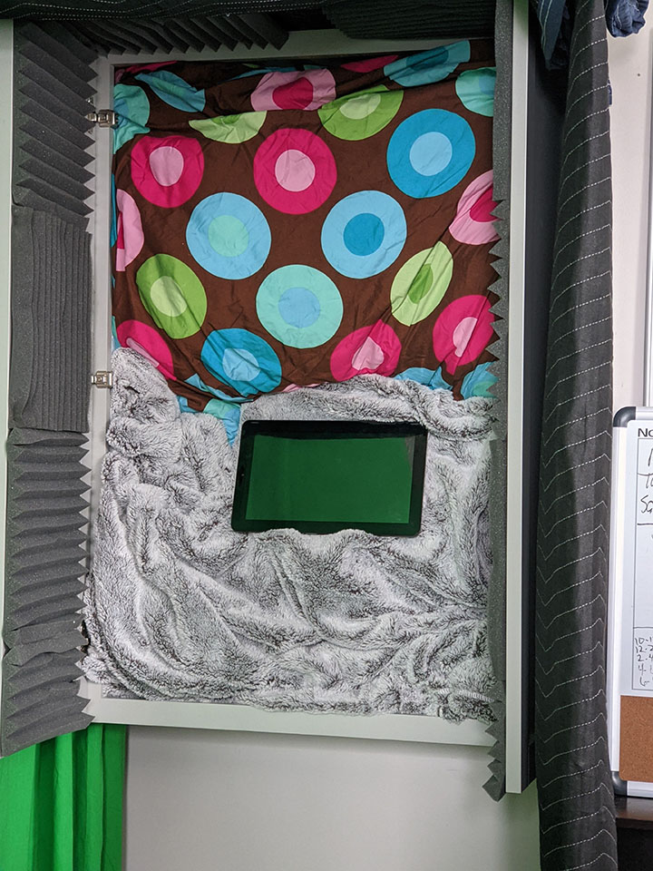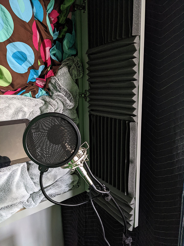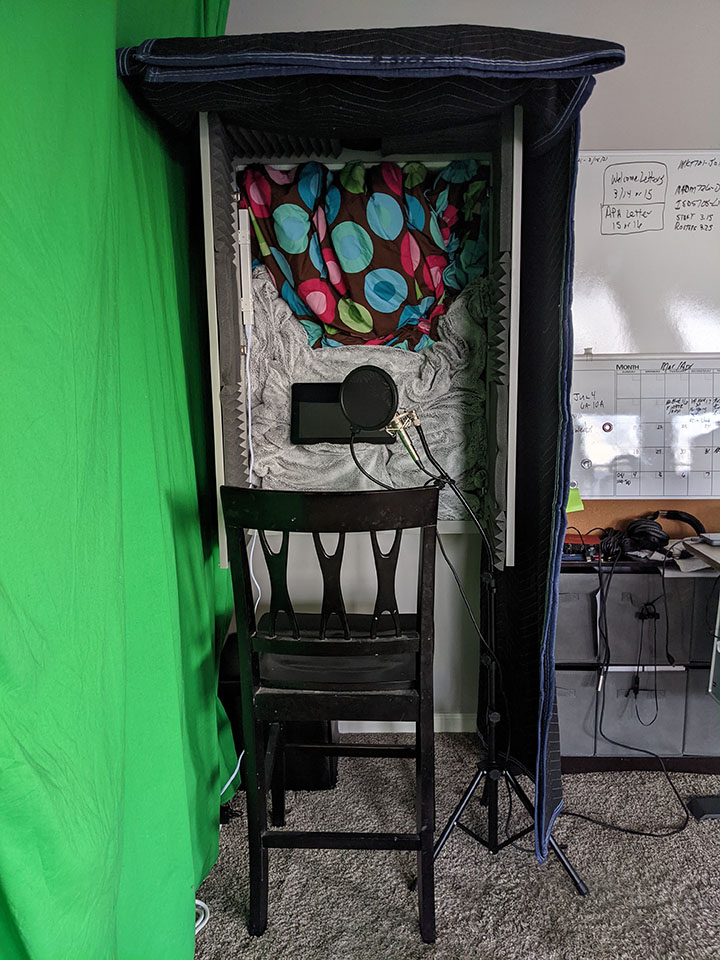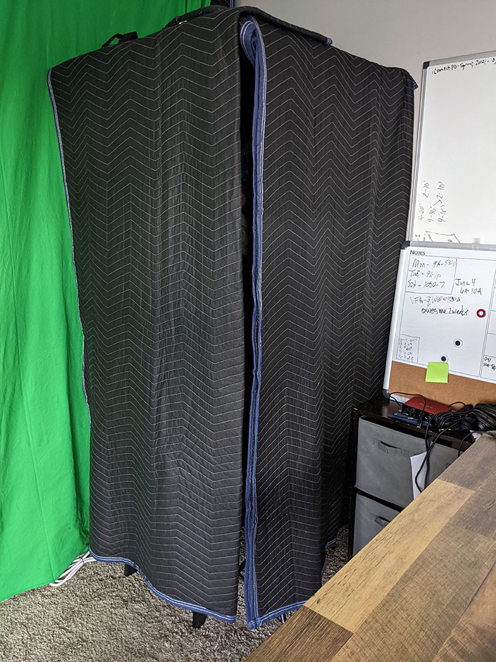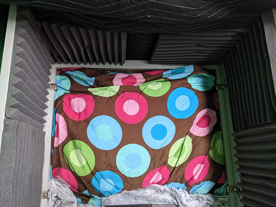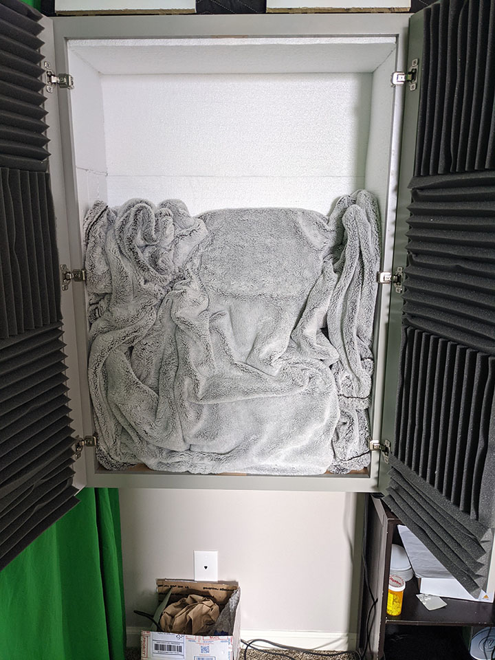 My voice box is a standard kitchen cabinet wrapped with polyfoam inside and out. Stuffed it with pillows and blankets. Put some acoustic baffles and then wrapped it in moving blankets.