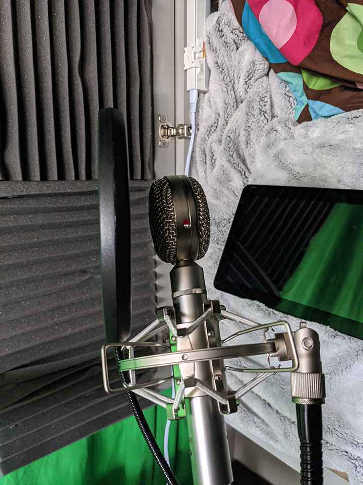 On the other hand, the acoustic treatment is usually used behind the singer/narrator (facing the mic as you can see in the photo). This is due to fact that the mics used to record vocals tend to have a cardioid pattern (like yours) which means that they only capture the sound coming from the front and sides, not the back of the mic, so having an acoustic treatment in that place helps a lot too. You can try using some absorption behind you instead of enclosing the mic in that ‘vocal box’