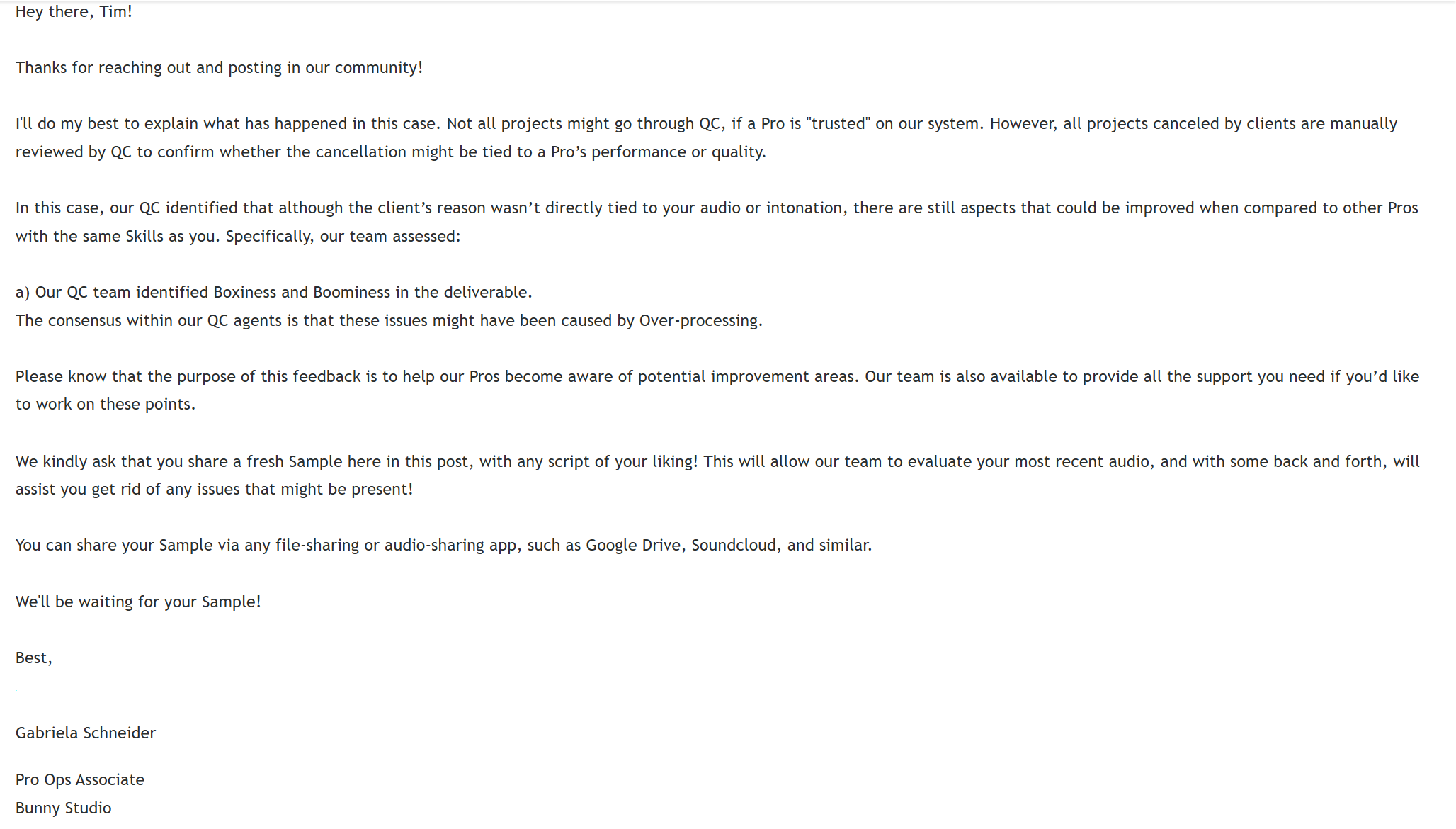 That said, after a careful review of your recent submissions, our Quality Control team identified some recurring technical issues—particularly boxiness, over-compression, and an overall processing-heavy sound. These problems affect clarity and naturalness, which in turn impact the client’s experience and can lead to rejections. We want to stress that this feedback is not about your interpretation or performance, but rather the technical consistency of your audio.