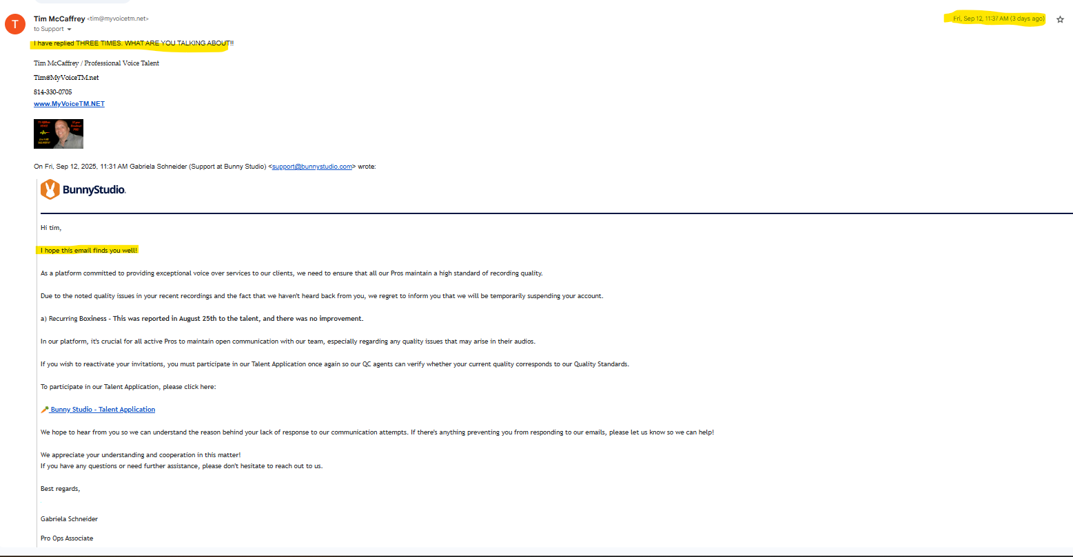 To be clear, I was on vacation last week (yes it was set) when someone (either you or an AI agent for you) reached out to me stating my account would be suspended. I still responded and still got no response, till now.
