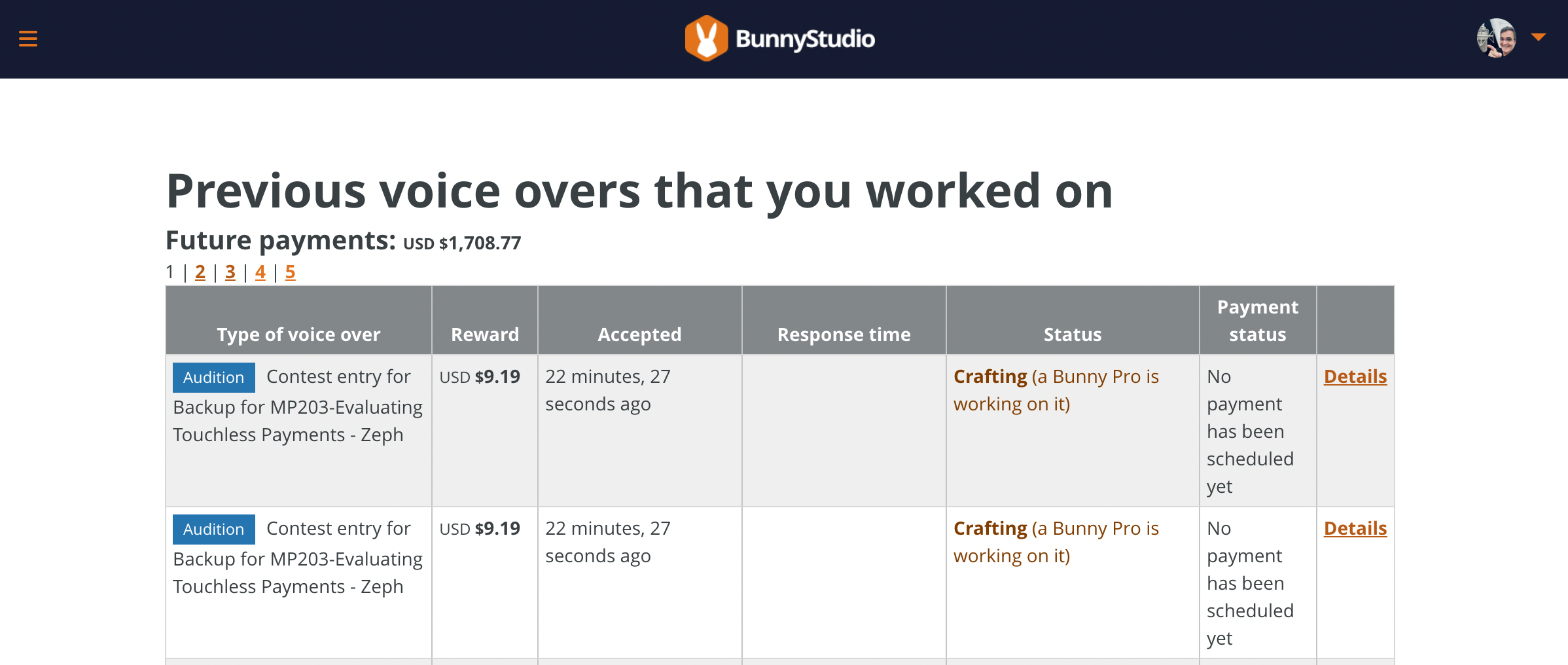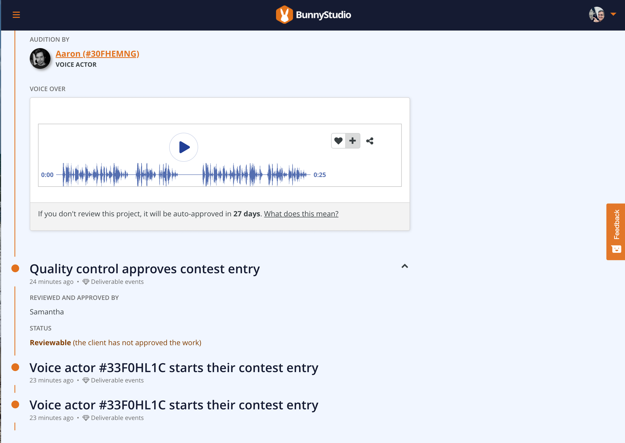 Yet when you go back to the contest page, it says you've started on your entry. But you haven't... because when you click on "Submit Audition", it keeps saying "project not assignable." So you can't upload anything. Despite your "Completed Projects" saying you're "crafting the VO".